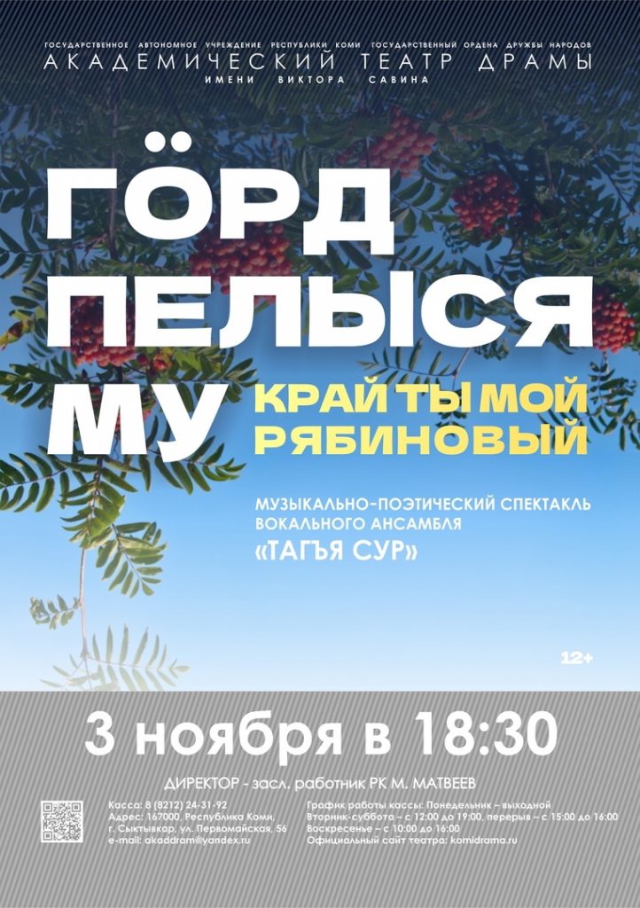 3 ноября в 18.30 вас приглашает в гости ансамбль «Тагъя сур». В исполнении Александра Кузнецова, Владимира Рочева, Светланы Мальковой и Константина Карманова прозвучат всем знакомые и любимые музыкально-поэтические композиции в программе «Гöрд пелыся му» («Край ты моя рябиновый», 12+). В …