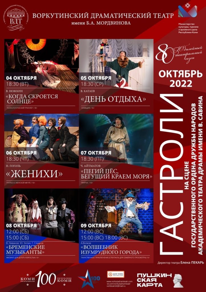 С 4 по 9 октября на сцене нашего театра проходят гастроли Воркутинского драматического театра им. Б.А. Мордвинова. Сыктывкарский зритель уже посмотрел психологический триллер «Когда скроется солнце» и комедию «День отдыха». Впереди еще 4 дня гастролей. Заполярные артисты покажут гротеск о …