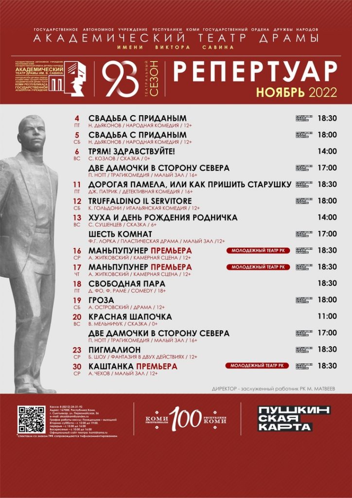Театр приступил к репетициям спектакля «Театр — моя жизнь» к 100-летию со дня рождения народной артистки СССР Глафиры Петровны Сидоровой Пока часть труппы находится на гастролях Молодежного театра РК в Якутске, а на нашей сцене продолжаются гастроли Воркутинского драматического театра …