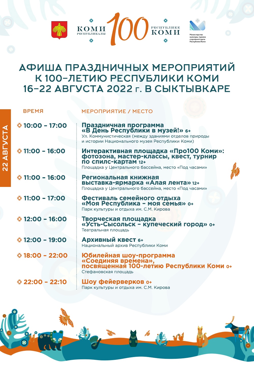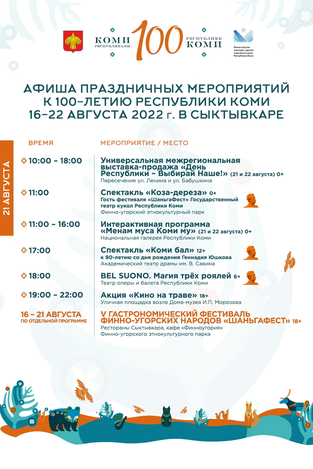 Представляем афишу праздничных мероприятий к 100-летию Республики Коми 17-22 августа в Сыктывкаре! 💥