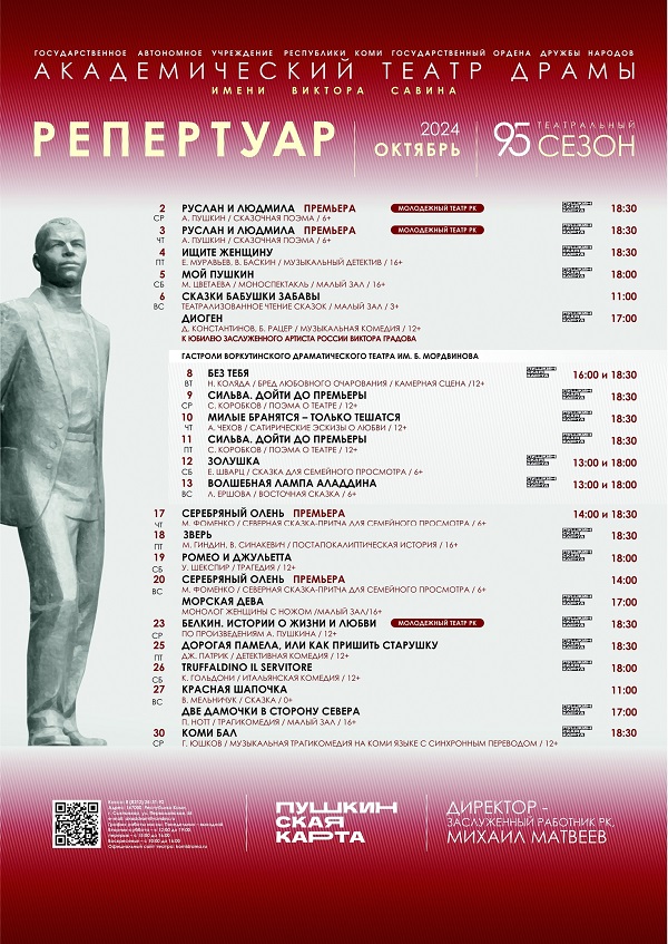 Внимание! По техническим причинам произошли замены: 22 августа вместо спектакля «Маньпупунер» Молодежного театра Республики Коми зрителей ждёт концертная программа «Танцуют все!!!» (12+). В исполнении ансамбля «Тагъя сур» прозвучат известные песенные хиты из культовых советских фильмов. 23 августа вместо спектакля «СКТВКР» приглашаем на …