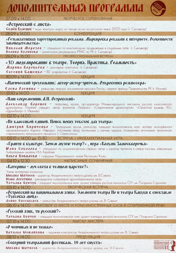 30 сентября труппа из Перми, которая уже второй раз принимает участие в Северном театральном фестивале, показала сыктывкарским зрителям «зАмАсквАрецкую кАмедию» «Бальзаминов», а на следующий день артисты вышли на сцену Театра драмы им. В. Савина со спектаклем «Лес».
