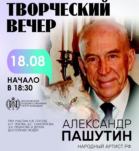 18 августа на нашей сцене Творческий вечер народного артиста России Александра Пашутина. Актёр снялся в более чем 200 фильмах и сериалах. В их числе — «Сказ про то, как царь Петр арапа женил», «Хождение по мукам», «Гардемарины, вперёд!», «ТАСС уполномочен …