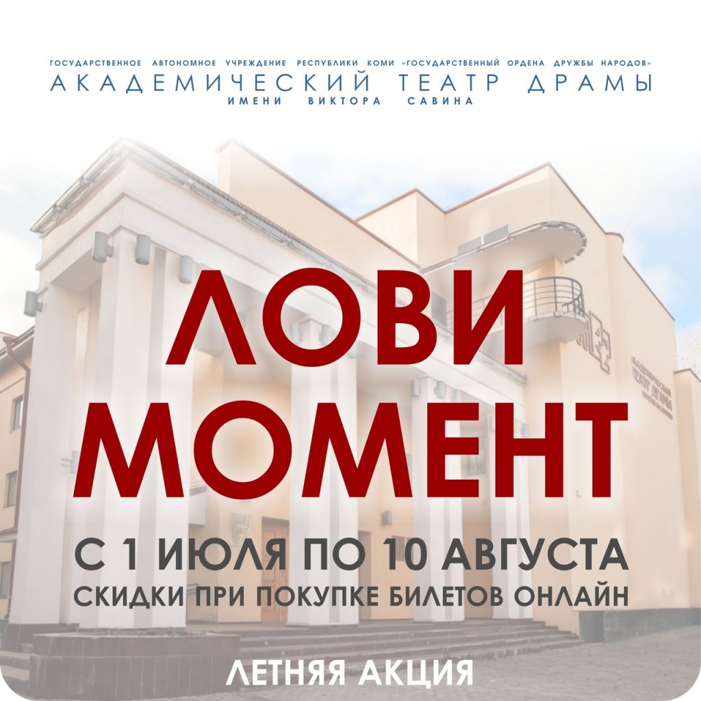 С 30 июня по 9 августа касса театра не работает, но билеты можно приобрести онлайн. Открыта продажа на спектакли V Северного театрального фестиваля, Творческий вечер народного артиста России Александра Пашутина. И театр объявляет летнюю акцию «Лови момент» — при покупке …