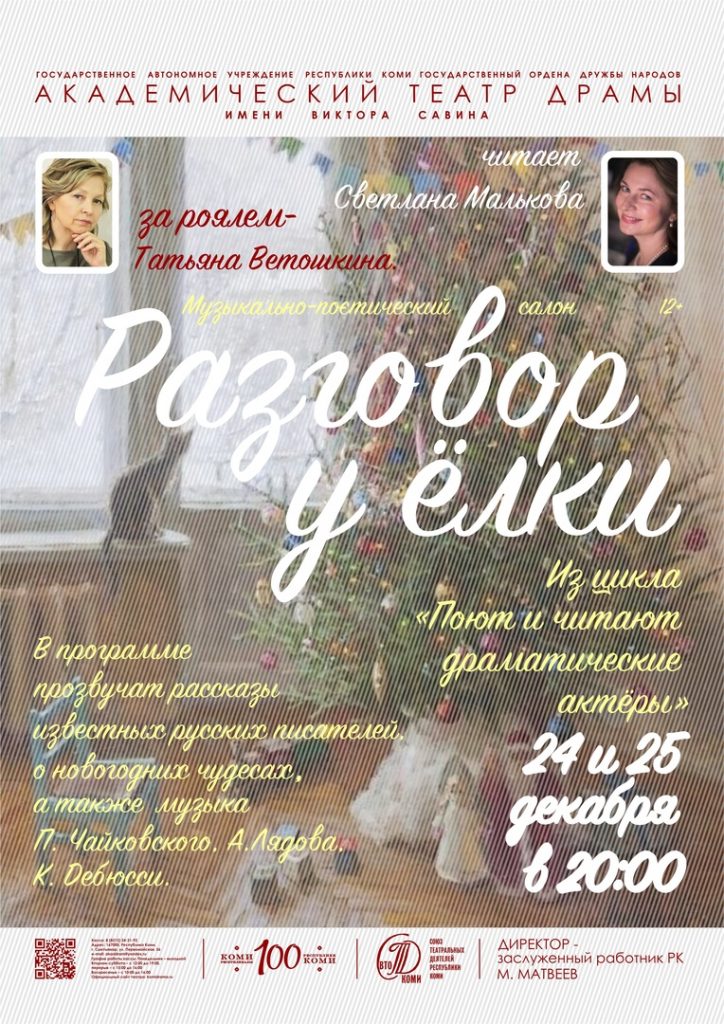24 и 25 декабря в 20:00 в круглом фойе театр состоится премьера проекта «Музыкально-поэтический салон Светланы Мальковой» из цикла «Поют и читают драматические актёры». Программа включает в себя рассказы «Ёлка» М. Зощенко, «Серебряное копытце» П. Бажова, «Чудо рождественской ночи» Н. …