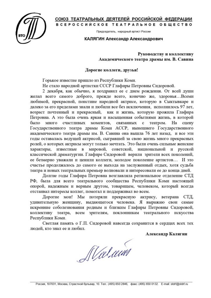 СОБОЛЕЗНОВАНИЕ от А.А.КАЛЯГИНА в связи с кончиной народной артистки СССР ГЛАФИРЫ ПЕТРОВНЫ СИДОРОВОЙ