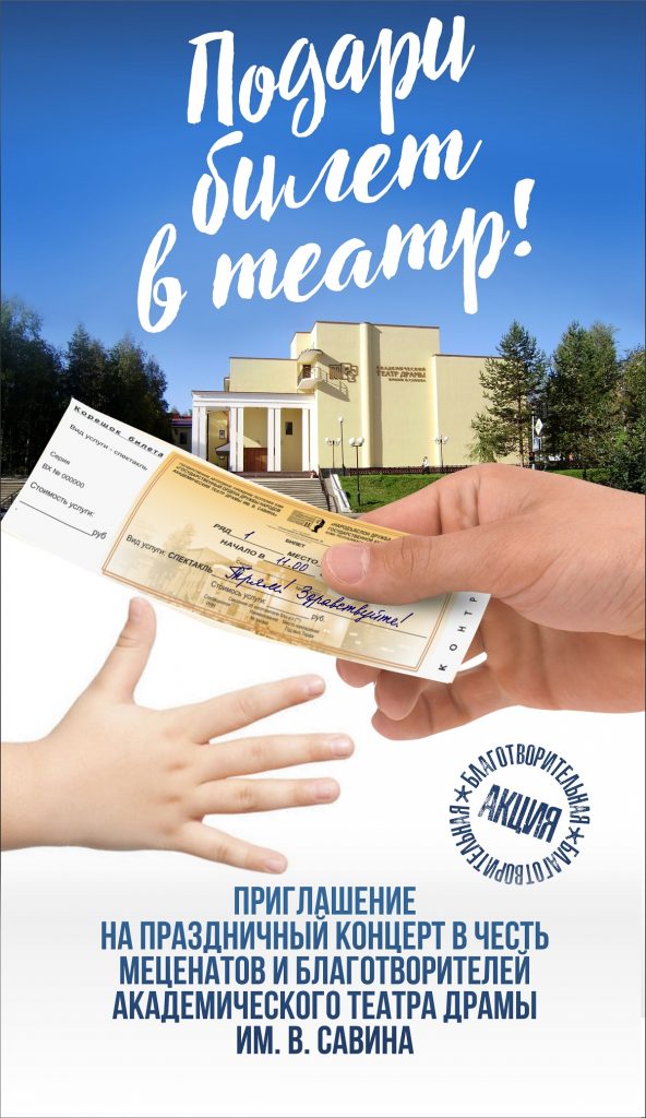 Дорогие друзья, принявшие участие в благотворительной акции «Подари билет в театр»! Приглашаем вас на Вечер открытых дверей для друзей театра, который состоится 23 декабря в 18.30. Вход по пригласительным билетам, полученным при приобретении билетов по акции! Справки по тел: 24-31-92
