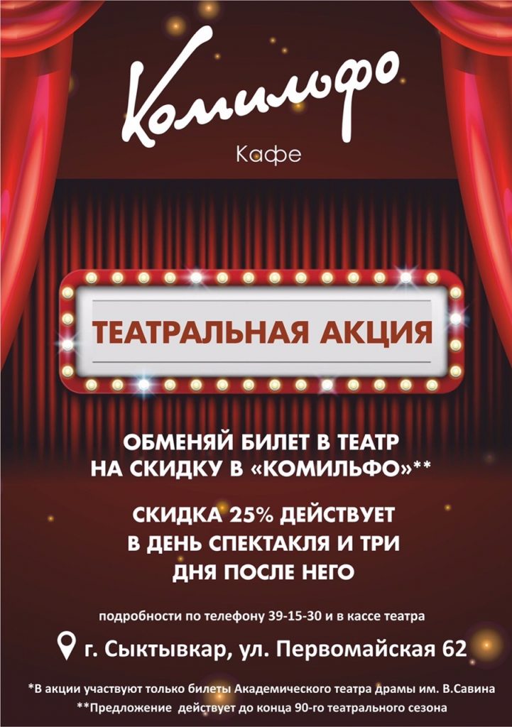 Дорогие зрители! Театральный сезон в самом разгаре, как и наша дружба с кафе «Комильфо». Наши партнеры дарят скидку 25% на все меню до конца 90-го театрального сезона!!! Скидка предоставляется в обмен на билет (чек) театра драмы и действует в день …