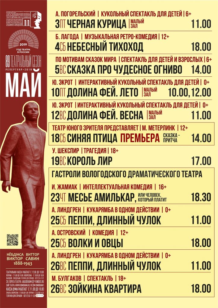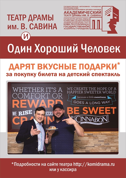 С 16 апреля стартовала совместная акция Академического театра драмы им. В. Савина и НКО «Один хороший человек» — за покупку билетов на детские спектакли Театра зритель получает подарочный сертификат на булочку от кафе «Cinnabon» (адрес кафе: ул. Коммунистическая, 50, ТРЦ …