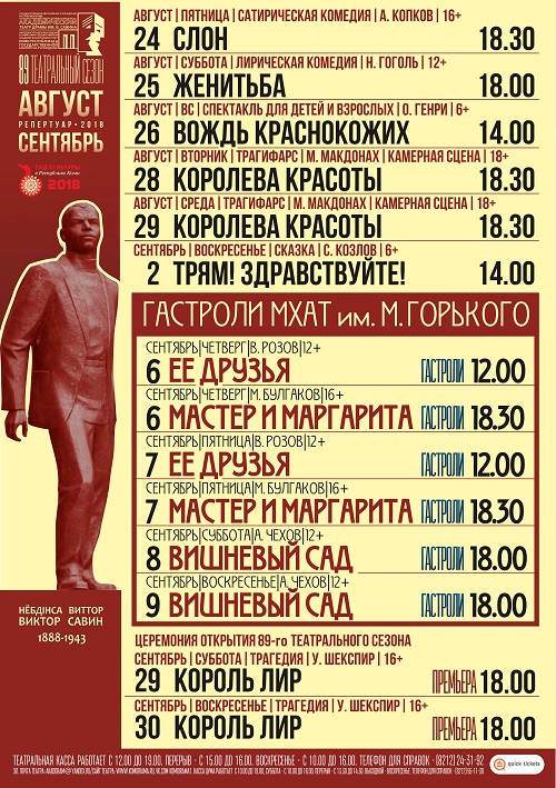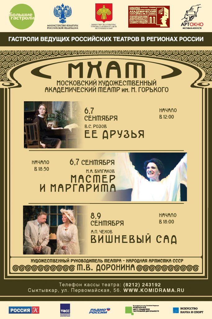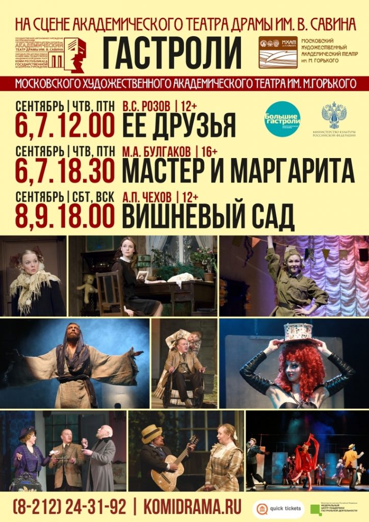 С 6 по 9 сентября в столице Коми пройдут гастроли МХАТ имени Горького. Артисты именитого театра представят три спектакля – «Ее друзья», «Мастер и Маргарита» и «Вишневый сад»