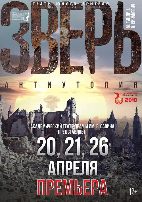 Всю неделю действует скидка 30% на премьеру «Зверь». (при покупке онлайн) https://quicktickets.ru/teatr-dramy-viktora-savina/e60 20 | 21 | 26 апреля — АНТИУТОПИЯ «ЗВЕРЬ» / 12+ Цена: 300-400 руб. (А со скидкой 210-280 руб.) Купить онлайн:https://quicktickets.ru/teatr-dramy-viktora-savina/e60