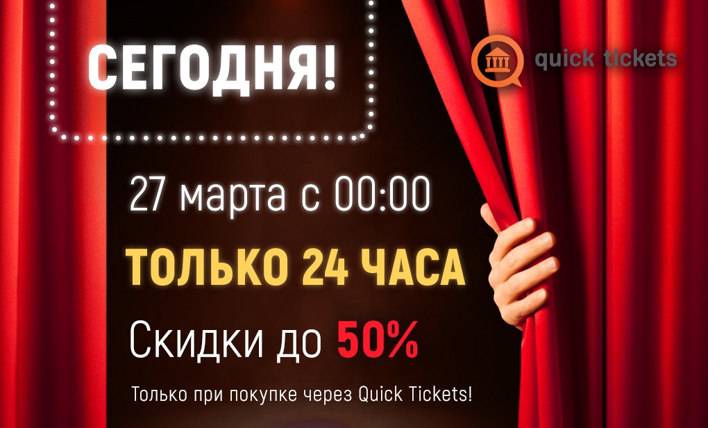 На сервисе Quick Tickets (quicktickets.ru) все мероприятия, участвующие в акции, помечены специальными красными стикерами. О их наличии сообщат специальные красные маркеры с указанным размером скидки. #27марта #акция #QuickTickets #драмтеатр11 #драмтеатр11