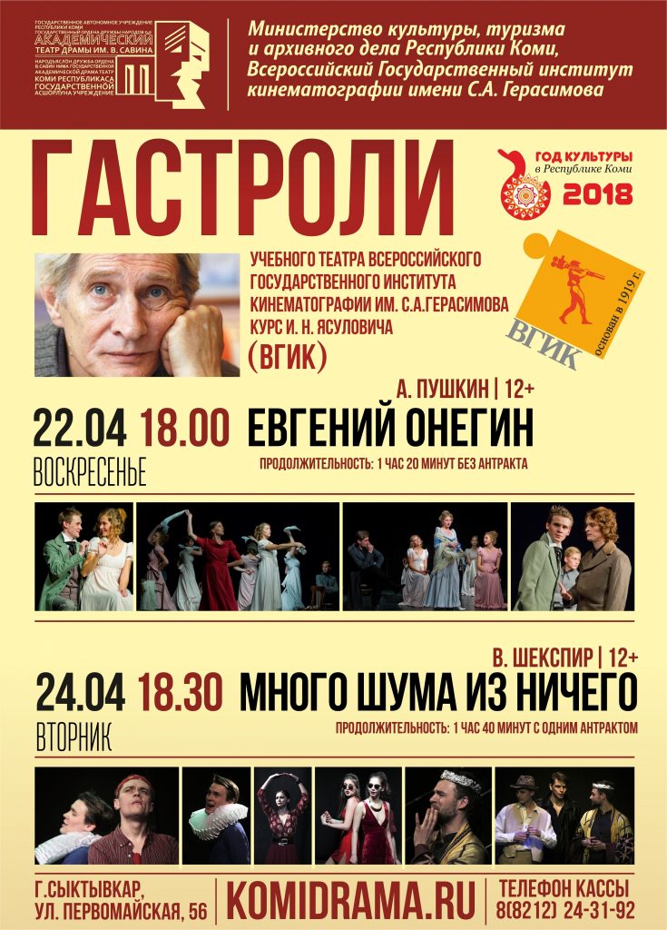 В рамках сотрудничества между Всероссийским институтом кинематографии и Министерством культуры, туризма и архивного дела Республики Коми студенты ВГИКа сыграют на сцене театра драмы им. В. Савина музыкально-литературный спектакль по роману в стихах А. Пушкина «Евгений Онегин» и шекспировскую комедию «Много …