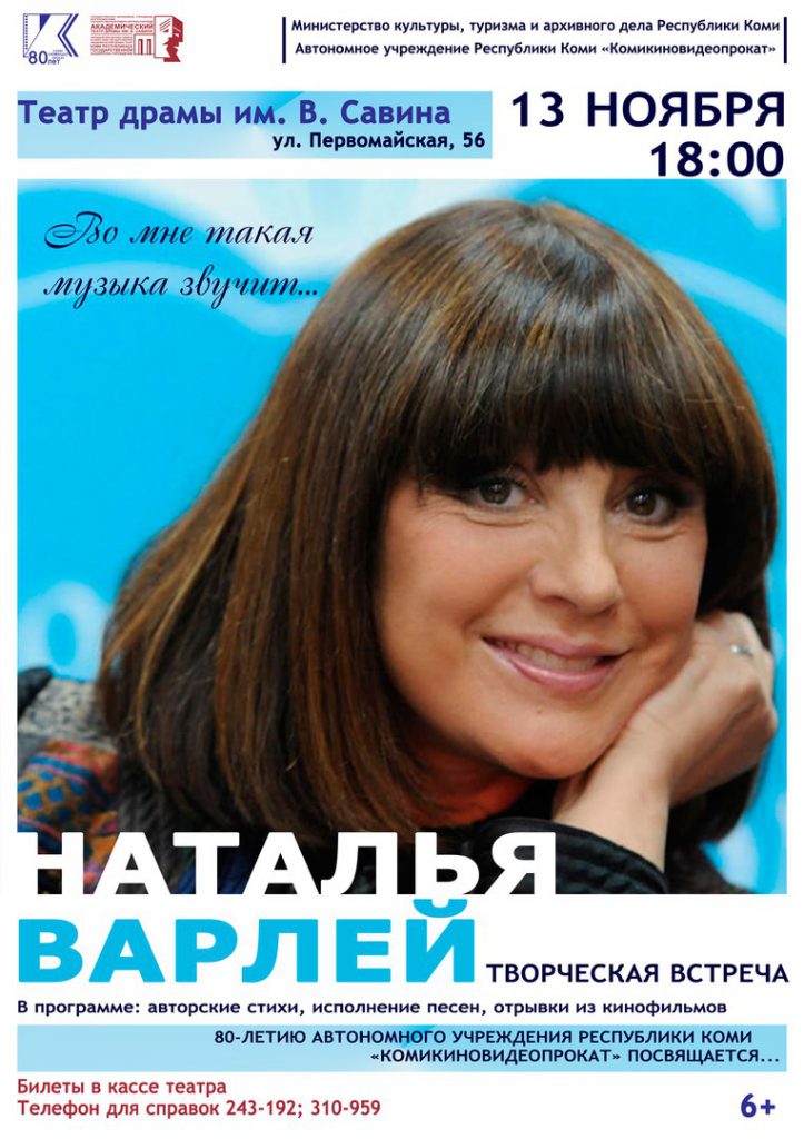 В Сыктывкар приедет знаменитая НАТАЛЬЯ ВАРЛЕЙ 13 НОЯБРЯ (понедельник) в 18:00 Возрастное ограничение – 6+ УСПЕЙТЕ КУПИТЬ БИЛЕТ! Заказ БИЛЕТОВ по : 24-31-92, 31-09-59 В рамках празднования своего 80-летнего юбилея Автономное учреждение Республики Коми «Комикиновидеопрокат» пригласило в Сыктывкар заслуженную артистку РСФСР …