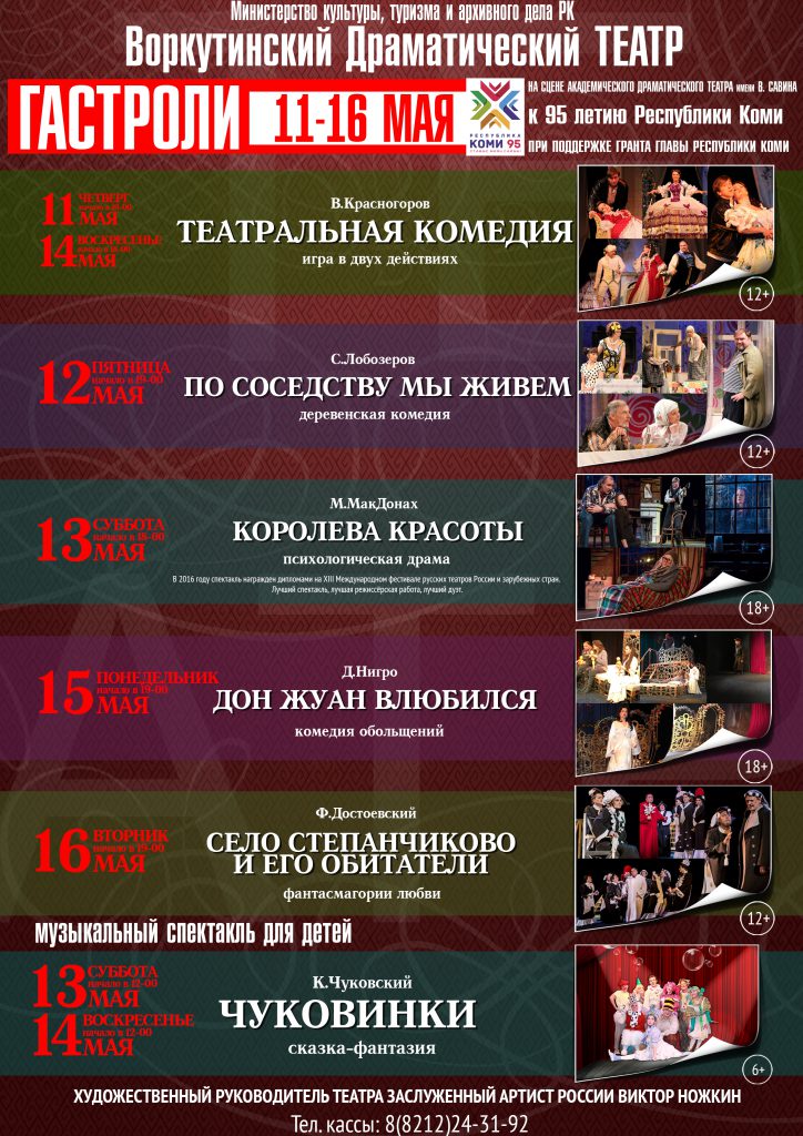 С 11 по 16 мая на сцене Академического театра драмы им. В. Савина состоятся гастроли Воркутинского драматического театра. Билеты уже в продаже. Тел.: 24-31-92.