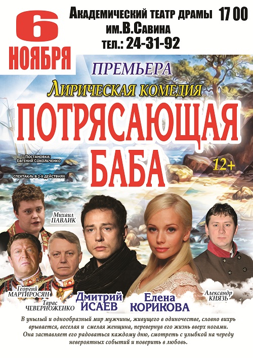 6 ноября в 17.00 на сцене Академического театра Драмы Елена Корикова и Дмитрий Исаев в спектакле Московского независимого театра «Потрясающая баба». Билеты в кассе театра: 24-31-92.