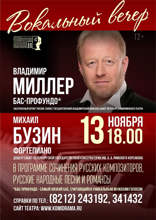 Заслуженный артист России, солист государственной академической капеллы Санкт- Петербурга и Мариинского театра Владимир Миллер исполнял оперные партии в постановках Нидерландской королевской оперы, театра Санкт-Петербургской консерватории, Большого театра Лодзи и ряда других. Регулярно выступает с сольными программами …
