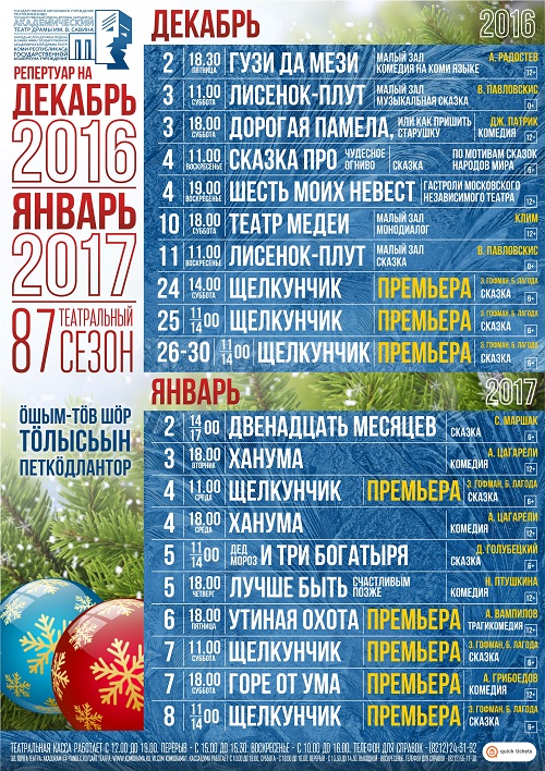 Вниманию зрителей! Открыта продажа билетов на декабрь и праздничные дни января 2017 года. Справки по тел.: (8212) 24 31 92