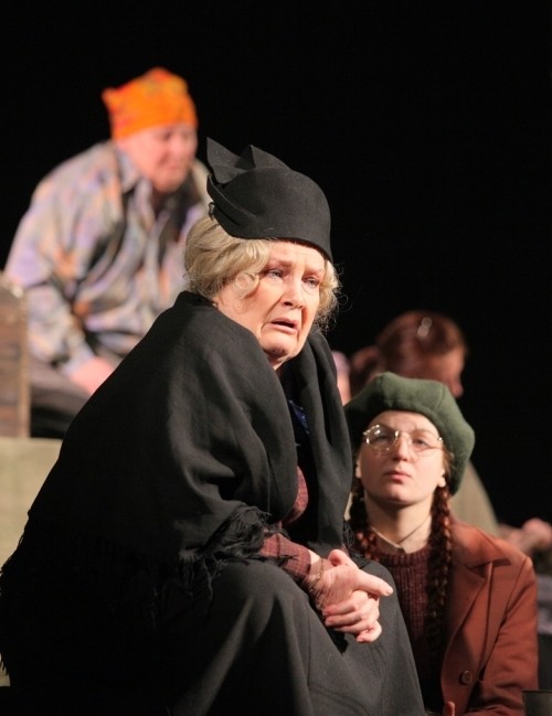 В спектакле не так много внешней фактуры. Рождение ребенка, судьбоносная встреча ранимой, беззащитной Ивы (Ольга Родович) с глухонемым поляком (Евгений Малофеев), встреча с беженкой (Людмила Мелехова), смерть Саввишны (Татьяна Темноева). Но неизменно и непрерывно здесь происходит одно нарастающее действие: объединенные общей бедой люди становятся чище, выше, душевнее, сплачиваясь в эшелоне, как в ковчеге во время стихии. В спектакле вообще много библейских мотивов. Вот старшая по вагону Галина Дмитриевна (Галина Микова) одним хлебом кормит своих попутчиков. Вот умирает в тамбуре (преисподней) смертельно больная Саввишна, как бы расплачиваясь за грех подозрения своих вынужденных соседей – в воровстве. Вот становится чище под натиском чужой беды легковесная распутница Лавра (Светлана Малькова). И на всем этом фоне лейтмотивом звучит еще одна личная трагедия – беспрерывный монолог Кати (Татьяна Михайловна), доходящей до безумия от страха за судьбу пропавшего мужа.